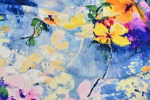 Bamboe tricot stof, olieverf bloemenprint, blauw/geel/groen/lila. P551