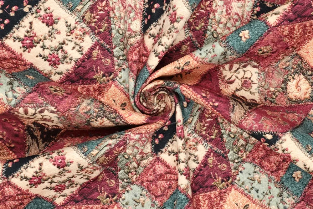 Mooie canvas denim stretch stof met een print van patchwork.