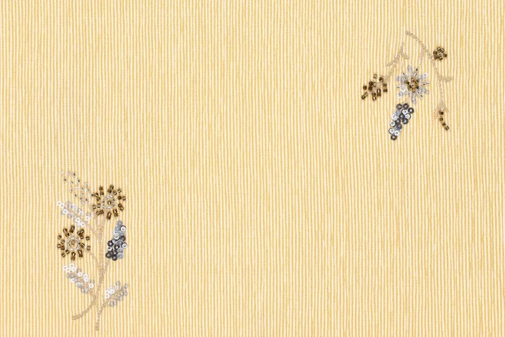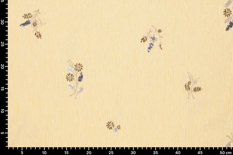 Crinkel streep stof, embroidery pailletten met kraaltjes bloemen, geel/offwhite/brons/zand. P373