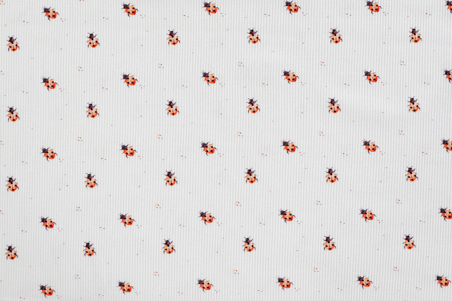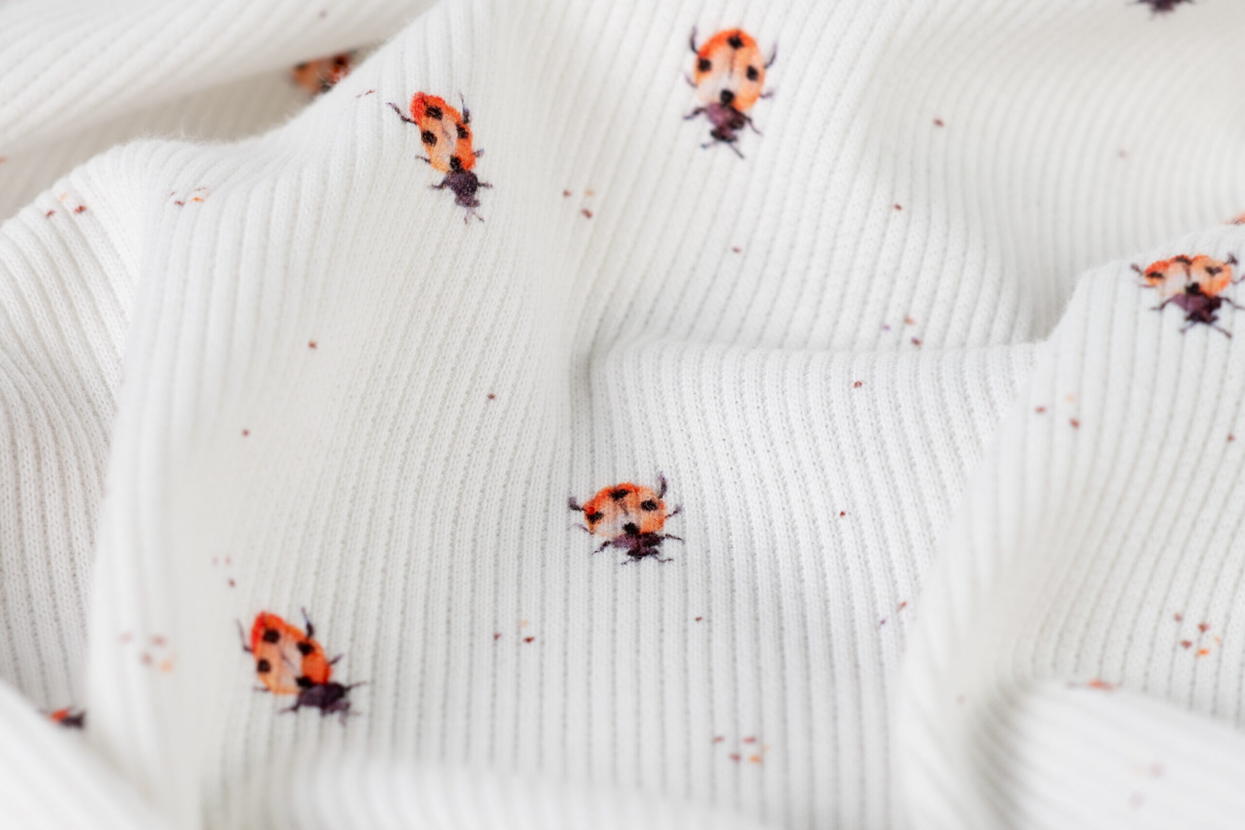 Mooie fijne rib jersey stof met een print van lieveheersbeestjes.