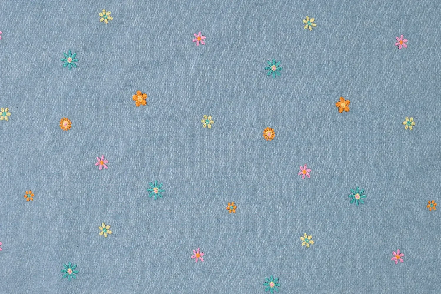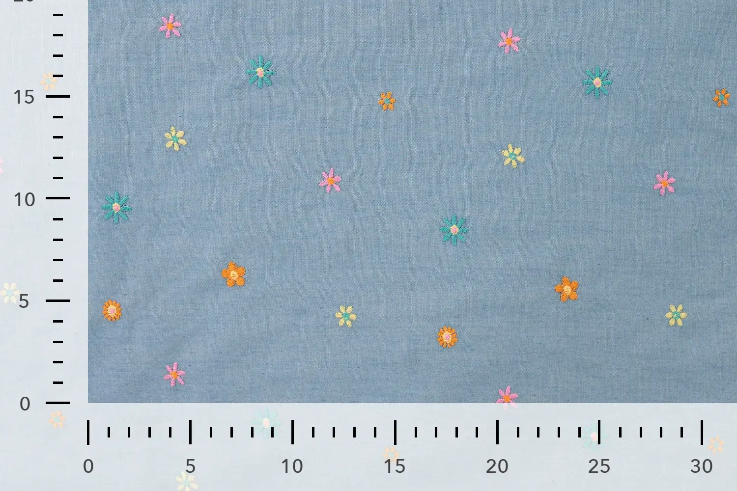 Geborduurde jeans stof, bloemetjesprint, blauw/roze/oranje/geel. P393