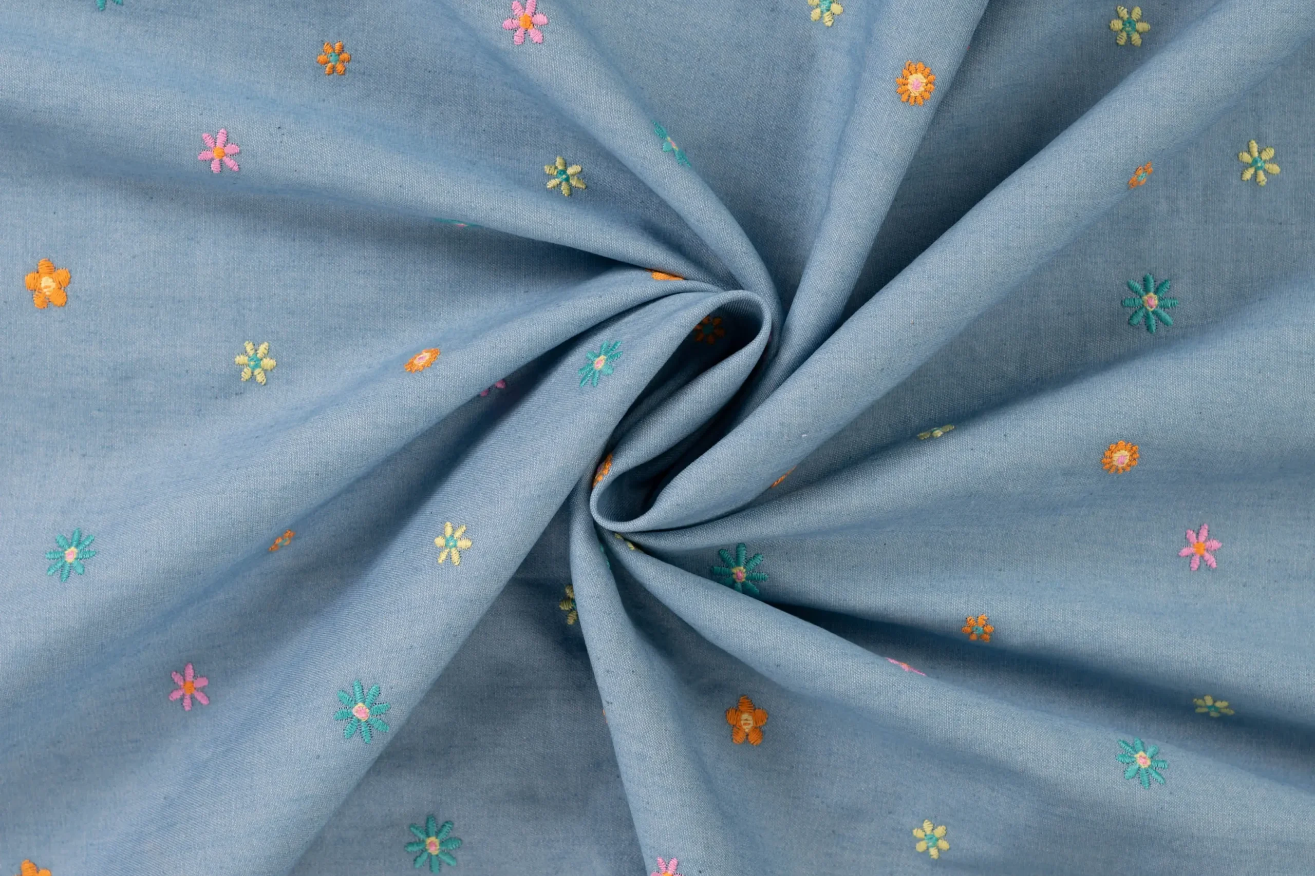 Mooie geborduurde jeans stof met een print van bloemetjes.