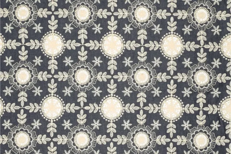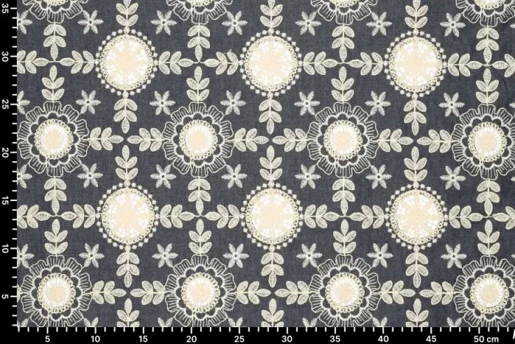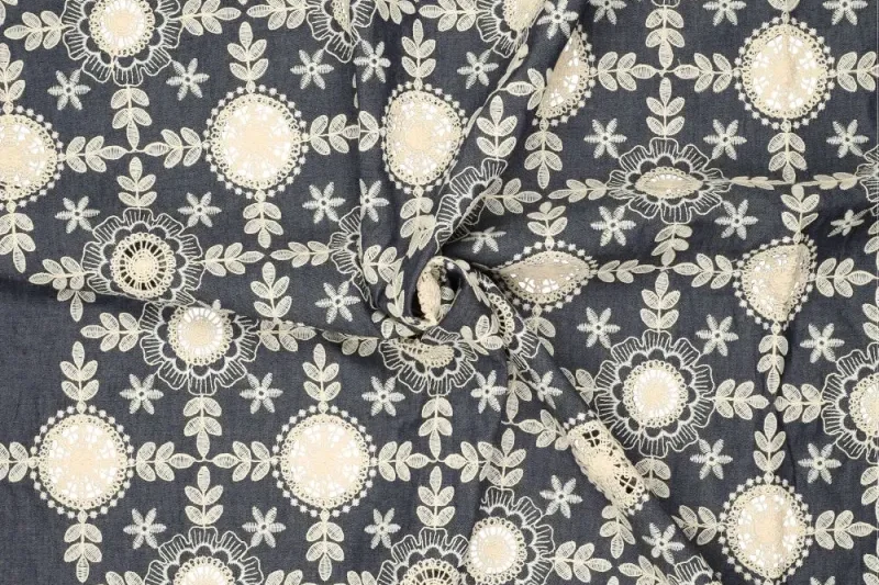 Geborduurde jeans stof, patchwork bloemen motief, donkerblauw/crème. P233