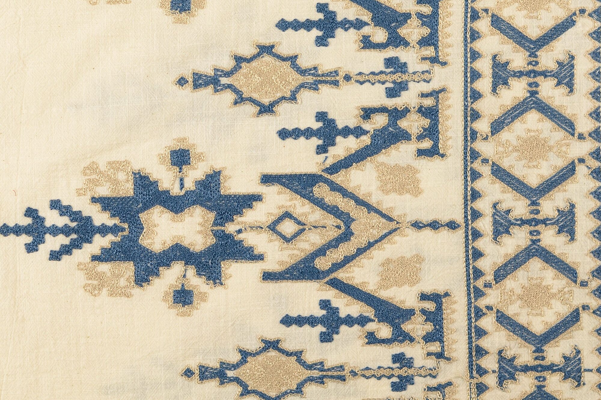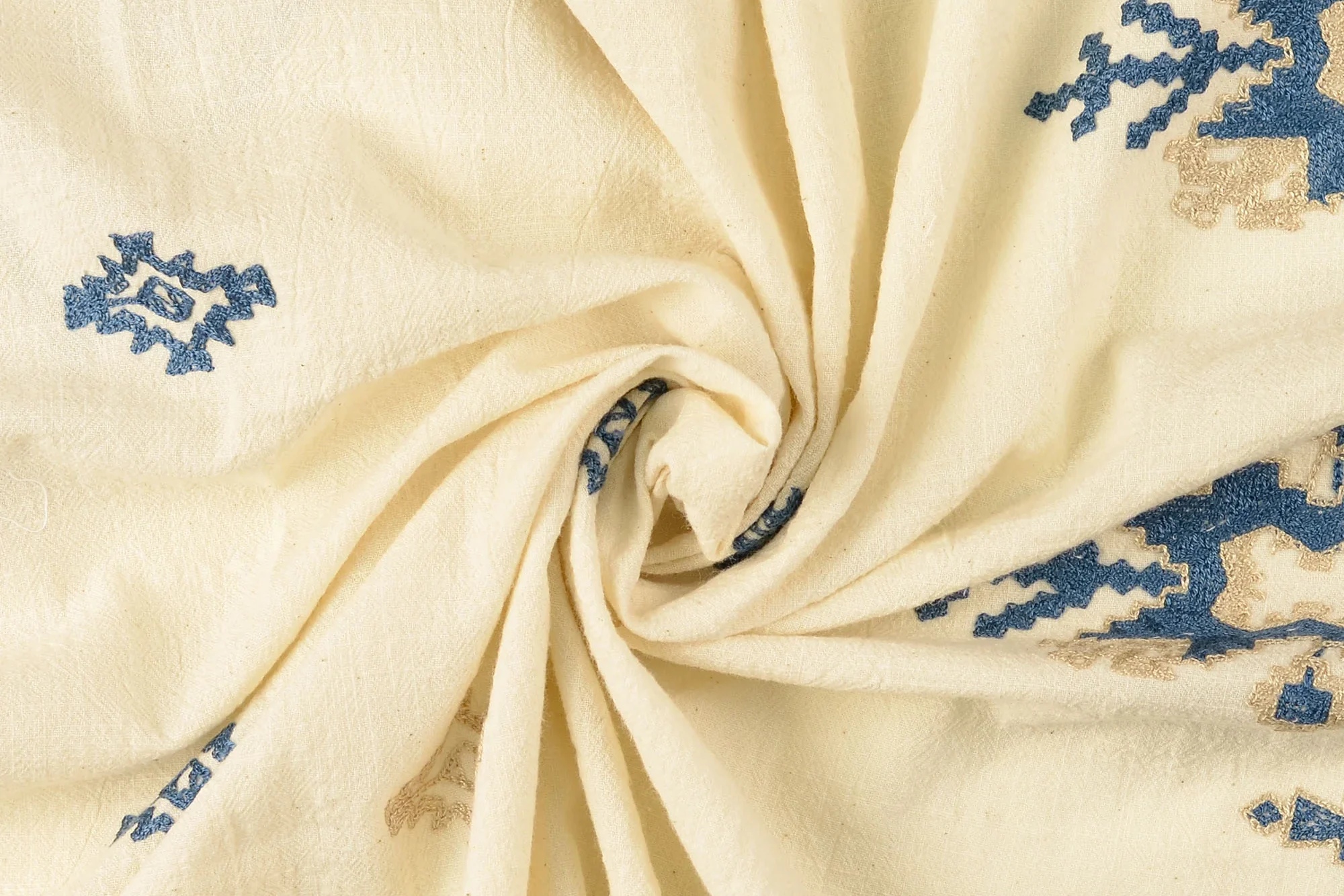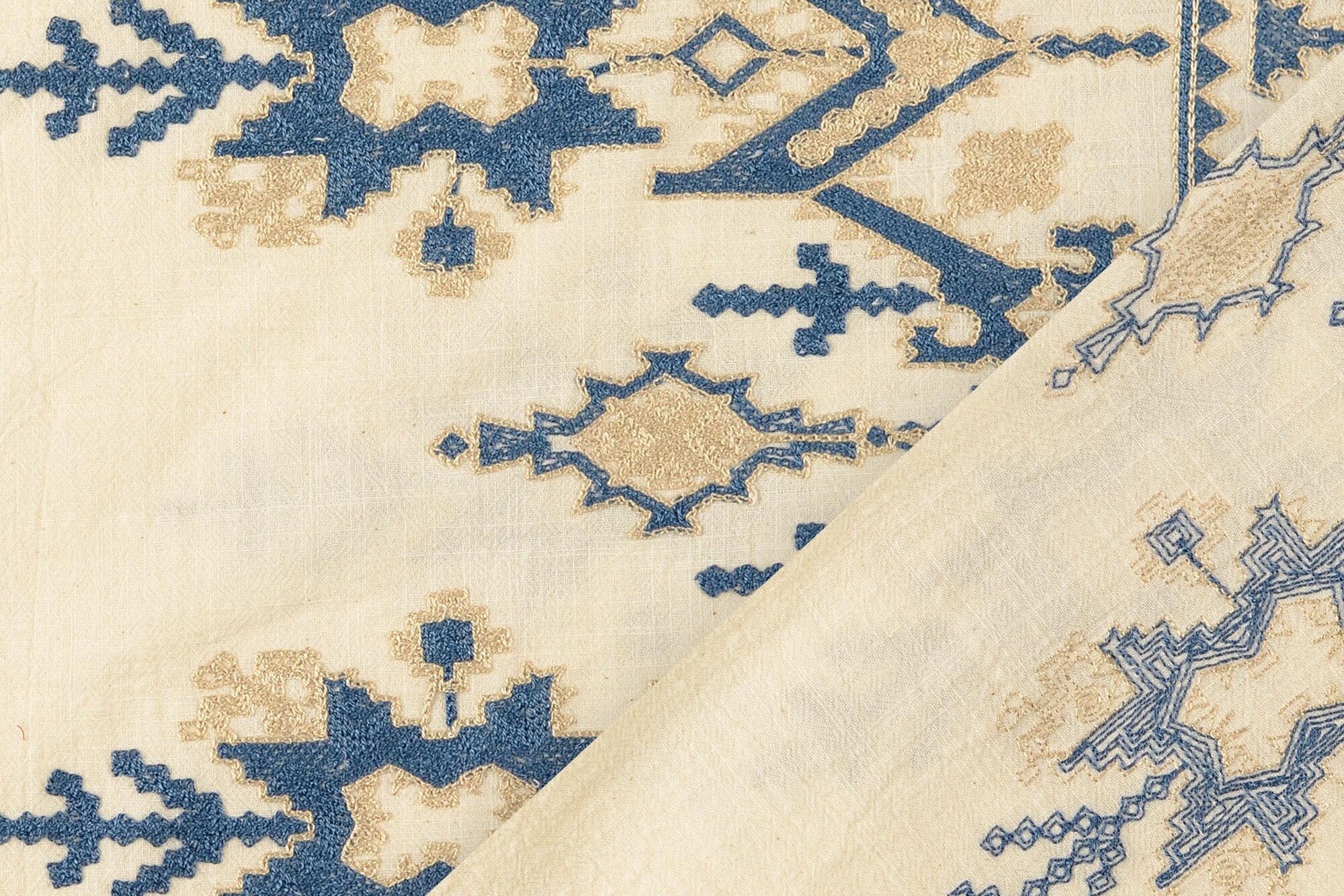 Geborduurde katoen stof, crème/blauw/zand. P312