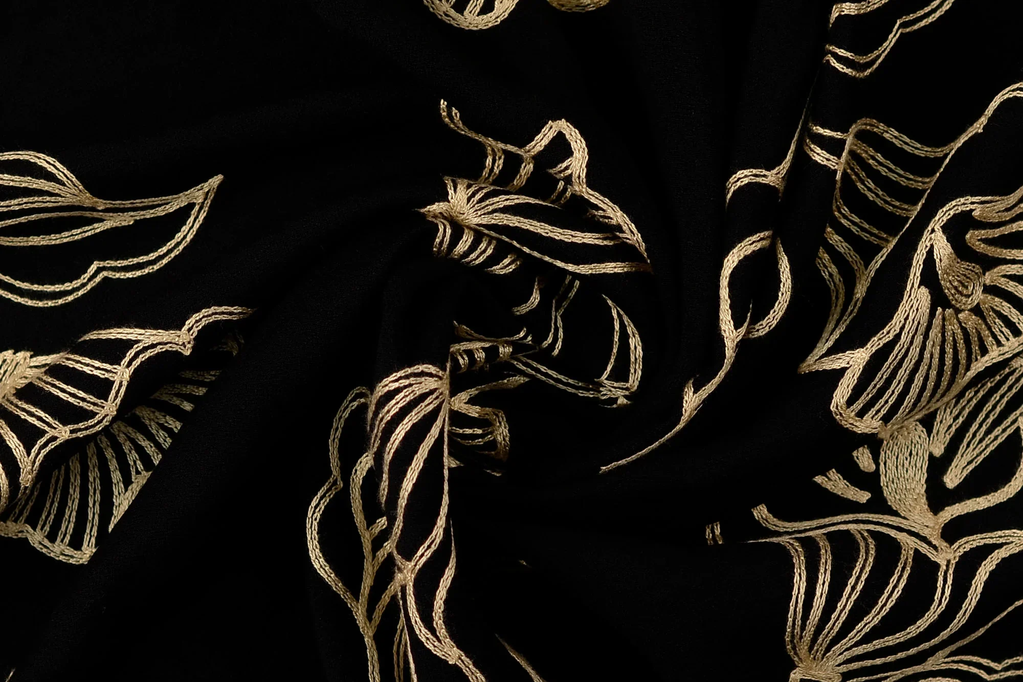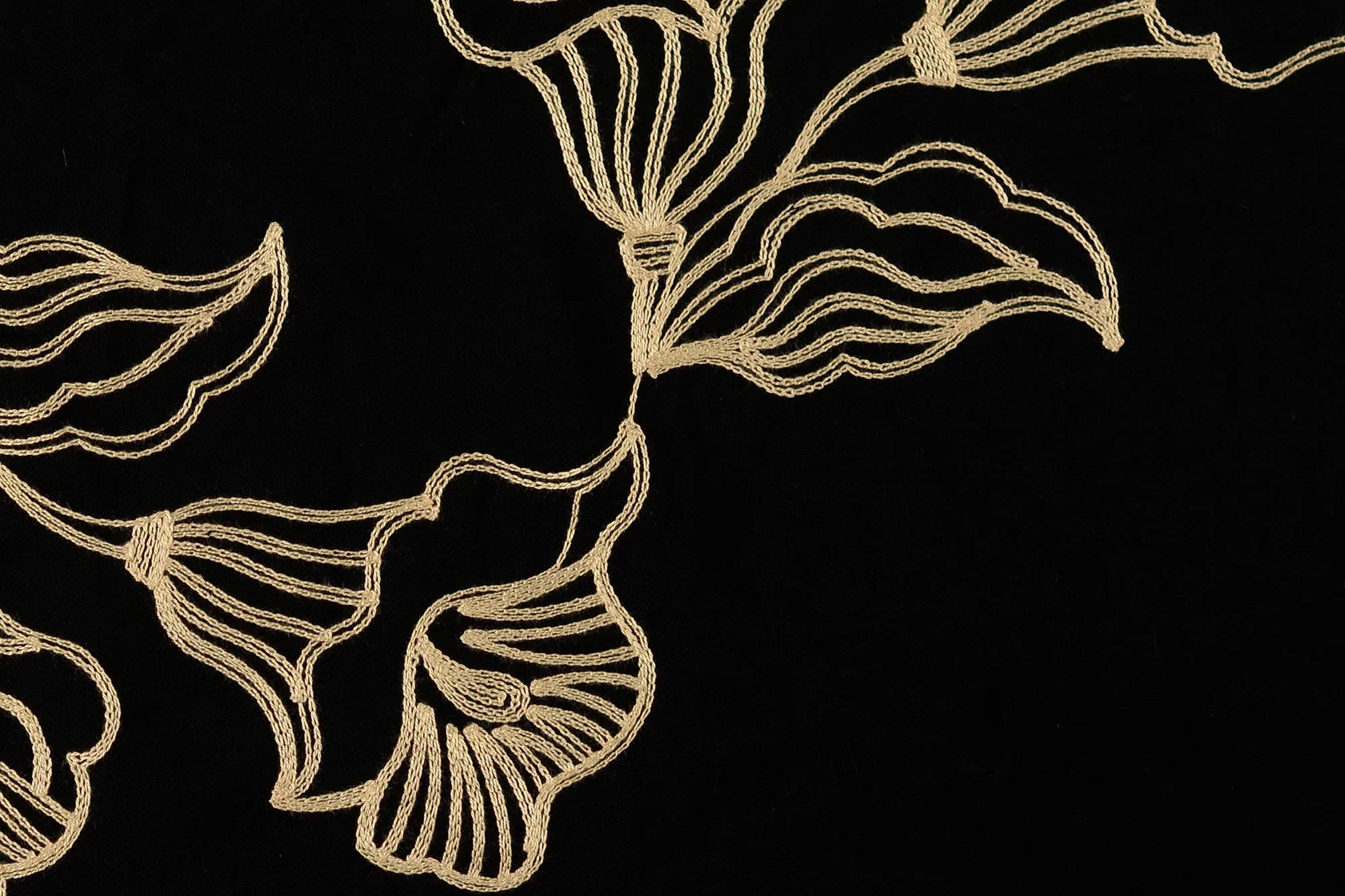 Geborduurde stof, bloemen motief, zwart/zand. P313
