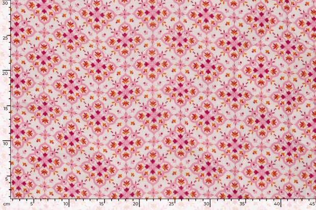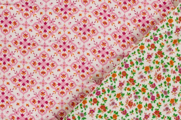 Gestepte katoen stof, dubbelzijdige bloemen met ornamentenprint, roze/groen/offwhite/roze/geel. P580