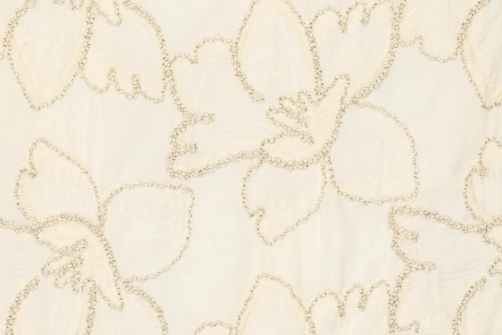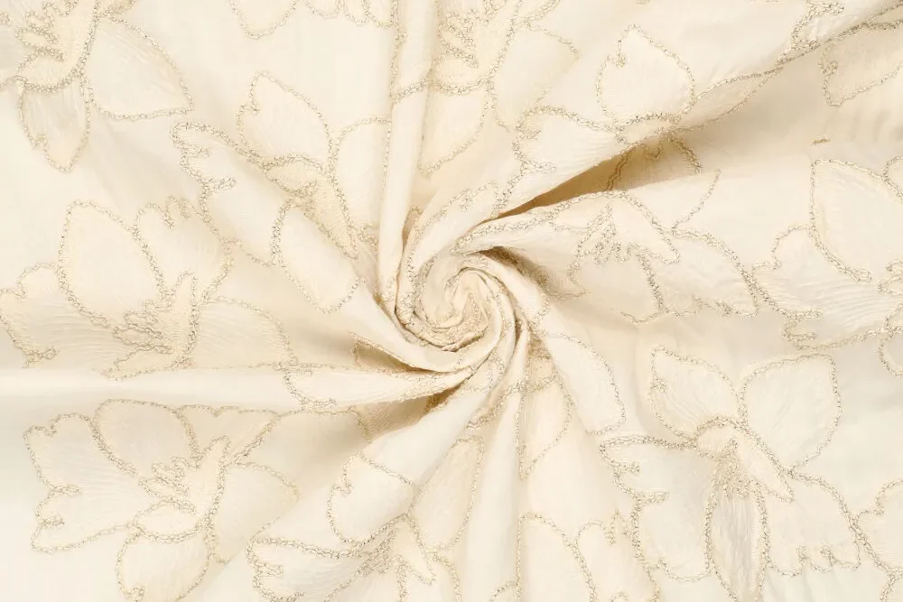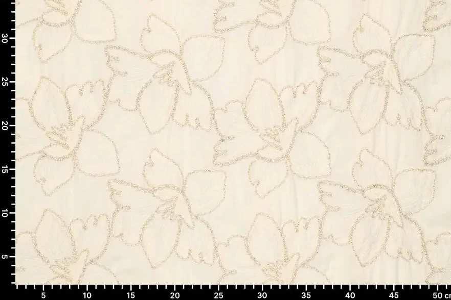 Katoen broderie stof, grote bloemen, crème/goud. P480
