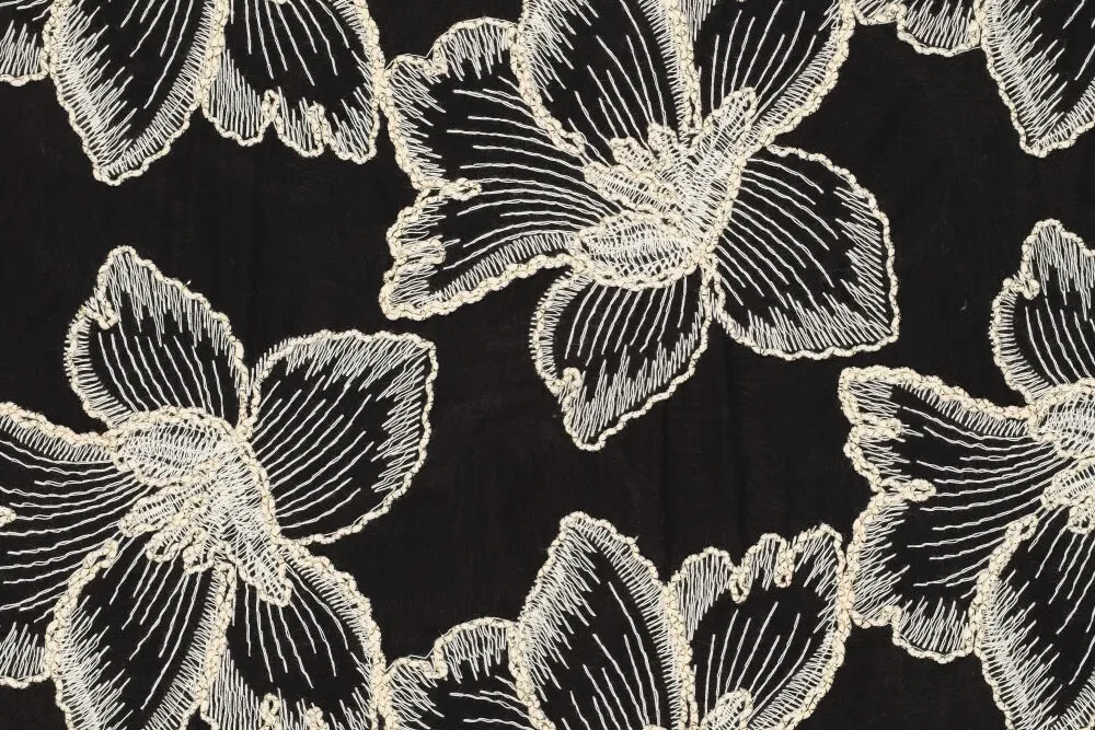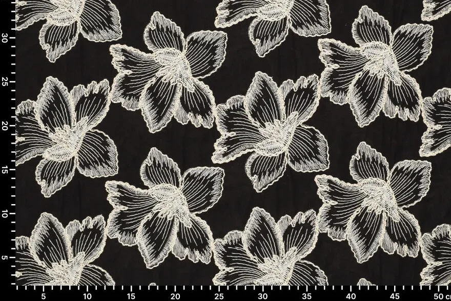 Katoen broderie stof, grote bloemen, zwart/crème/goud. P481