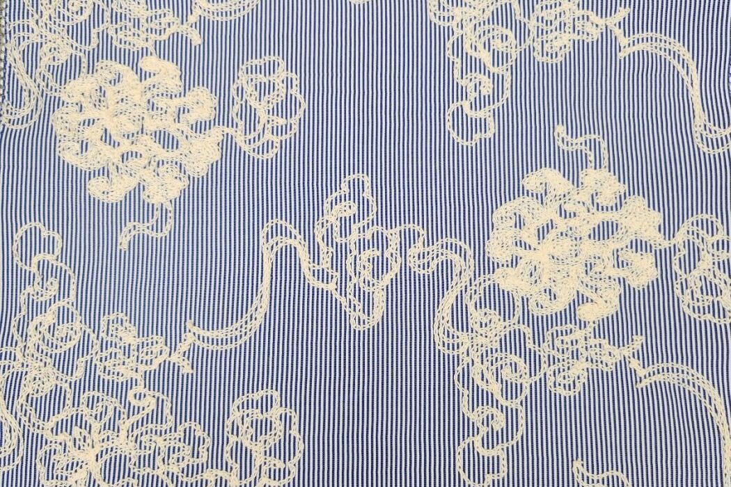 Katoen broderie stof, streep motief met geborduurde krullen, jeansblauw/wit/beige. P567