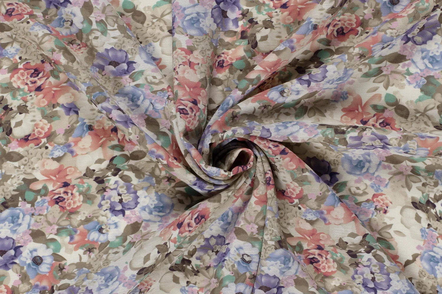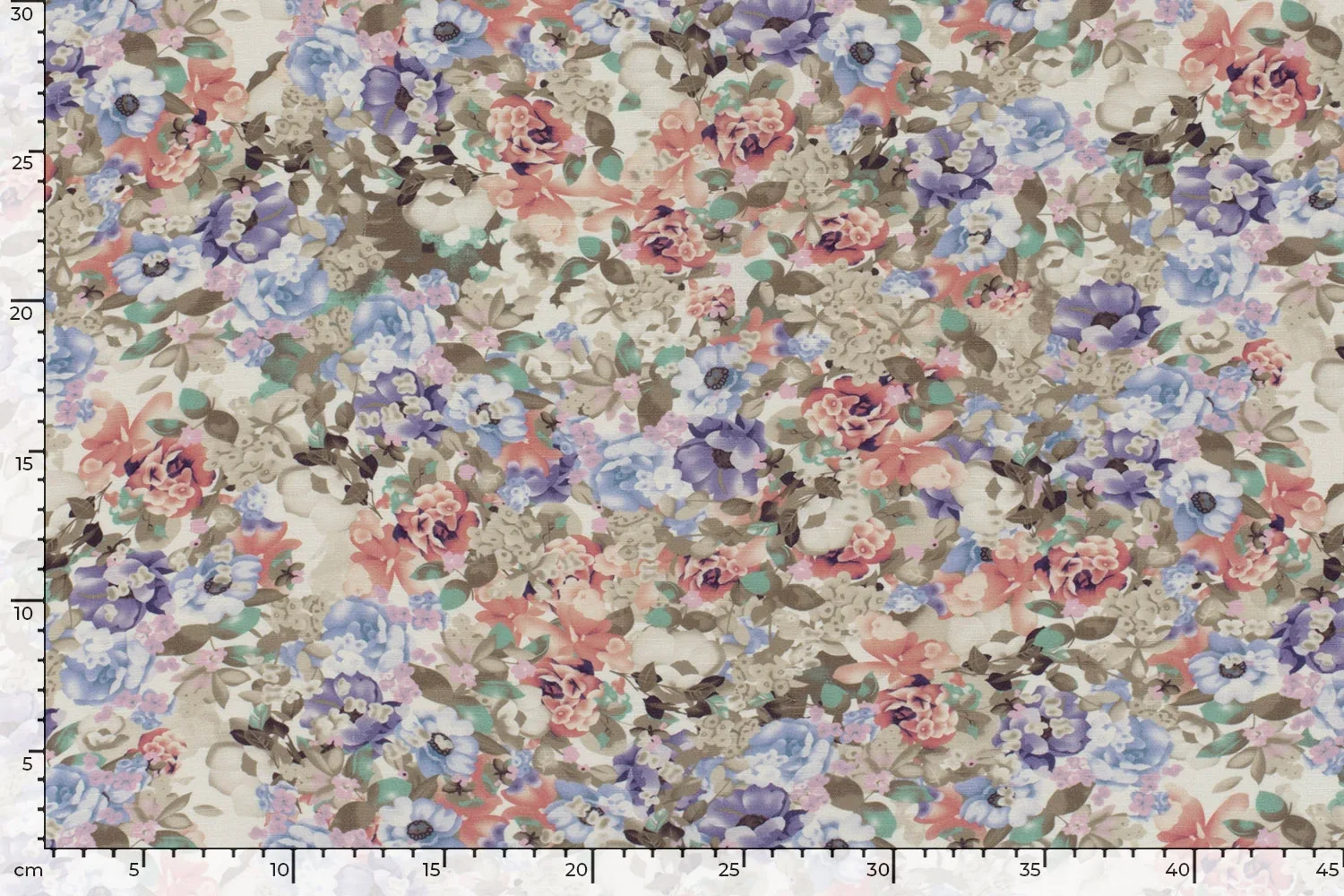 Linnen look stof, bloemen motief, groen/lila/roze/bruin/offwhite. P315