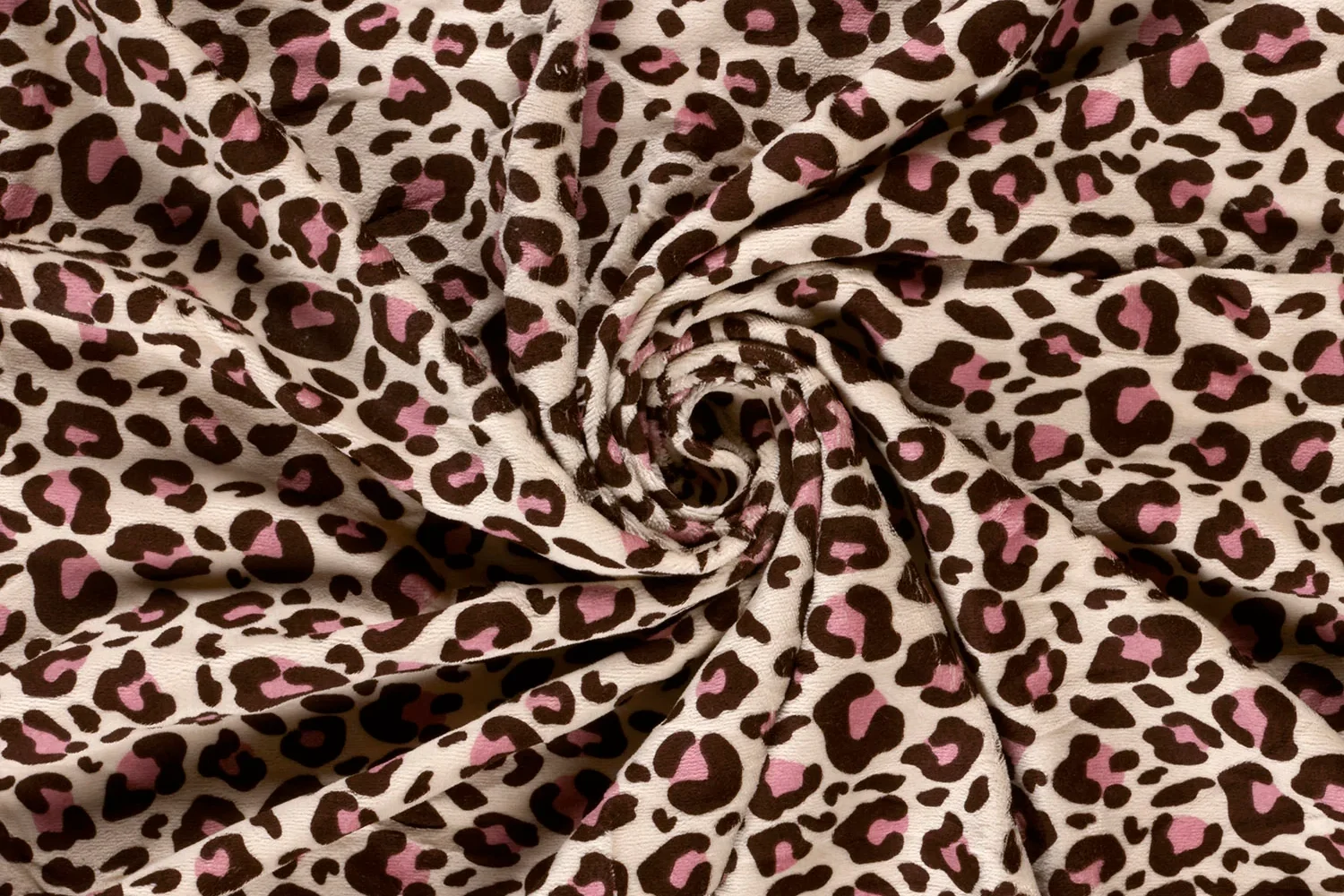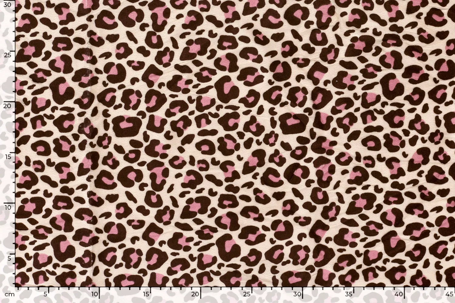 Nicky velours stof, panterprint, ecru/bruin/roze. P138