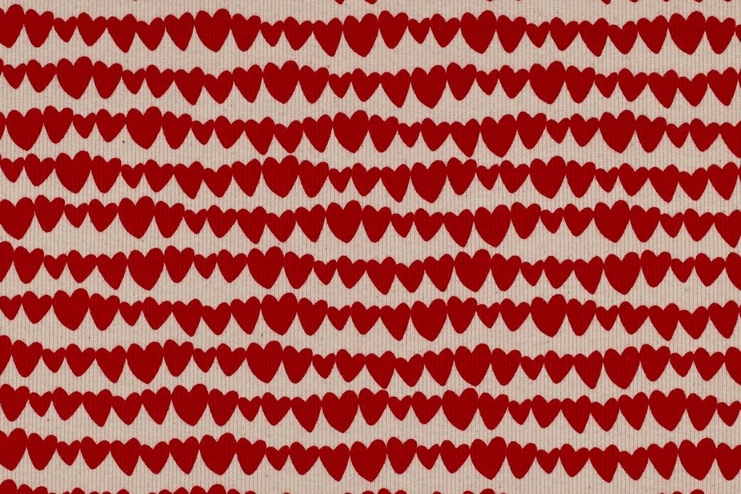 Rib jersey stof, hartjesprint, ecru/rood. P656