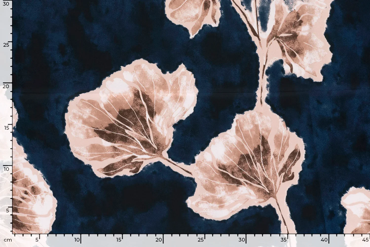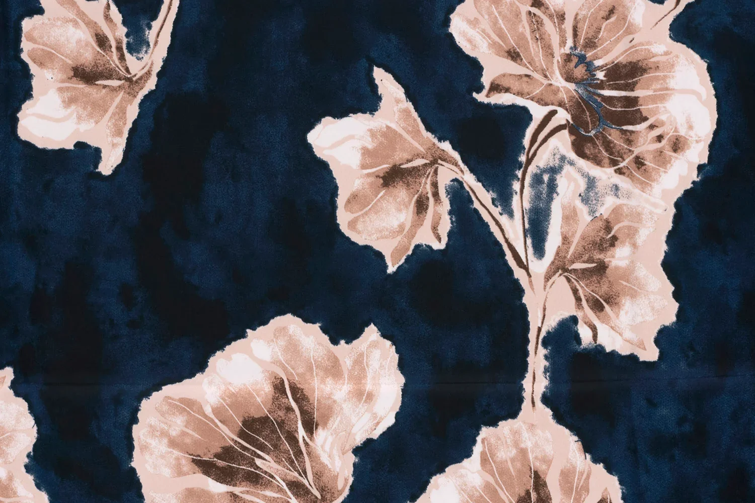Satijn de luxe stof, grote bloembladprint, blauw/bruin/roze. P334