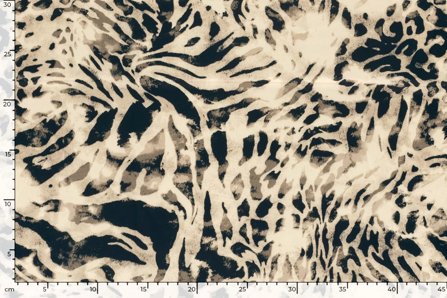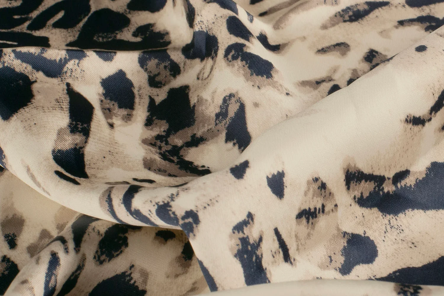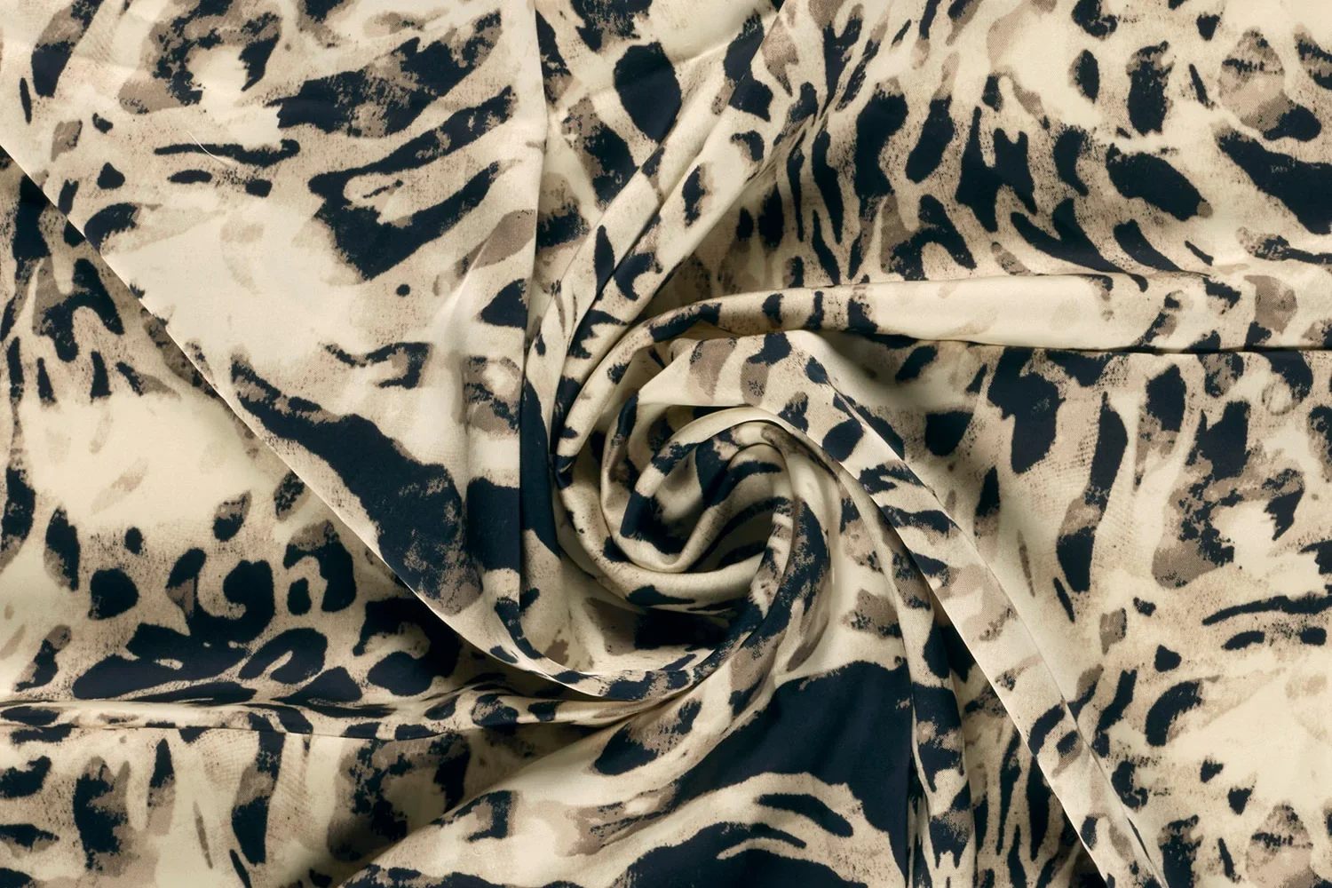 Satijn duchesse stof, dierenprint, offwhite/blauw/taupe. P322