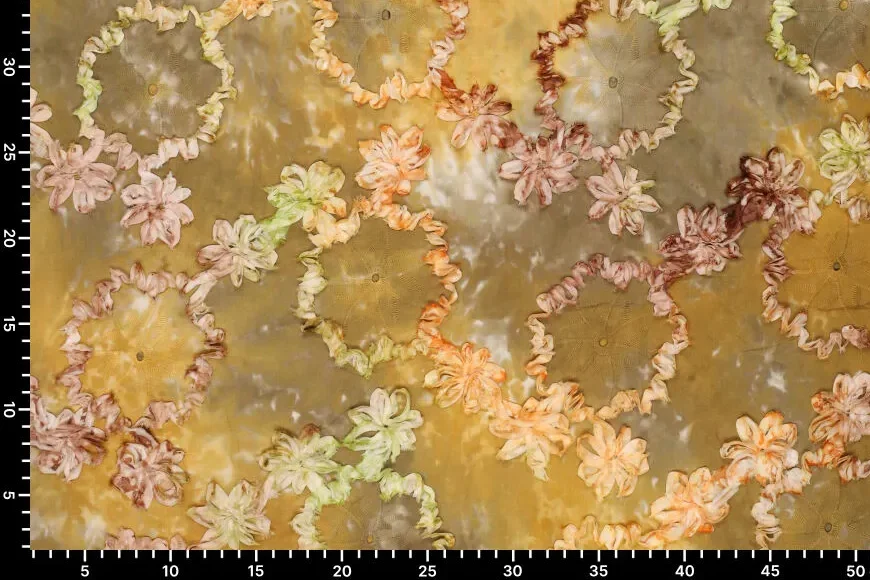 Tie dye broderie stof, geborduurd lint, geel/groen/zand. P475