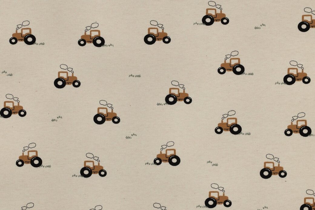 Tricot katoen GOTS stof, tractoren print, naturel/camel/groen/zwart. P621