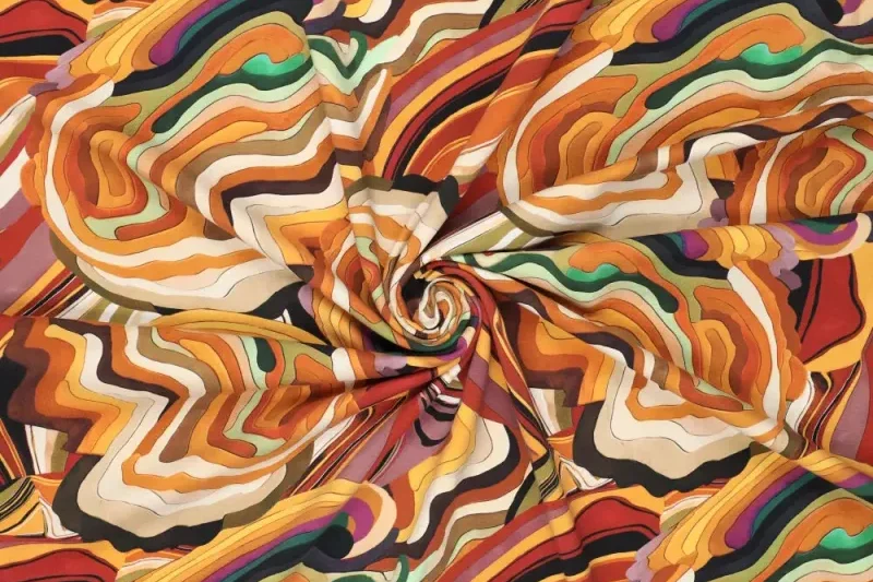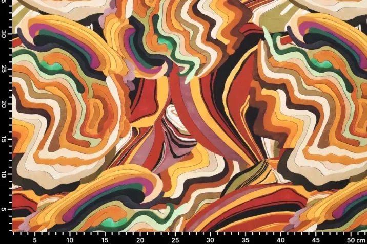 Tricot katoen stof, abstracte golvenprint, geel/groen/zand/paars. P241