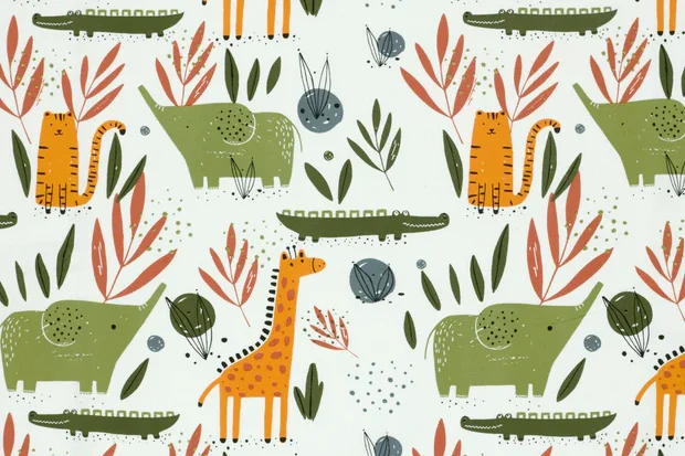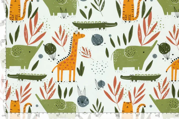 Tricot katoen stof, dierenprint, offwhite/groen/oranje. P469