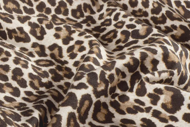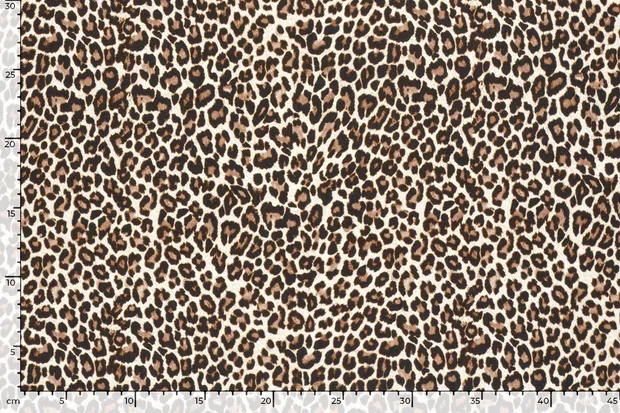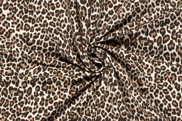 Tricot katoen stof, digitale panterprint, zand/camel/zwart. P108