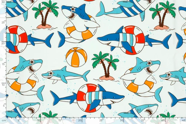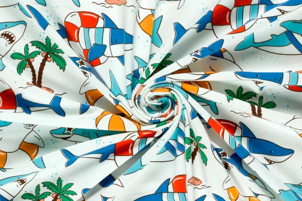 Tricot katoen stof, haaien in zwembadprint, offwhite/rood/blauw. P467