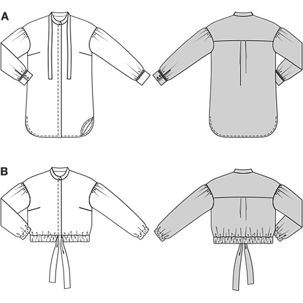 De tweede variatie is een blouse jasje met volumineuze, diepliggende mouwen en een verborgen knoopsluiting. Het ziet er fantastisch uit in luxe satijn of organza!