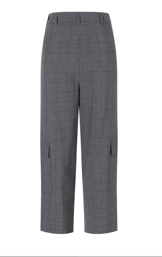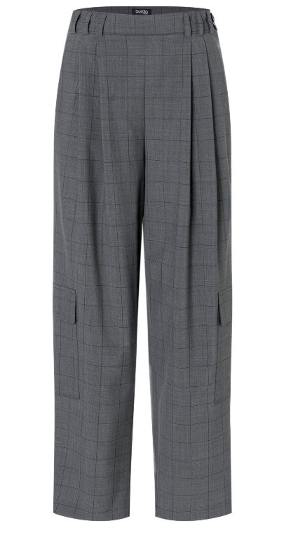Broek variatie 2 toont een fijn geruite cargobroek, ideaal voor op kantoor of voor alledaags. De drievoudige riemlussen aan de voorkant en de optionele XL-zakken maken hem tot een echte blikvanger.