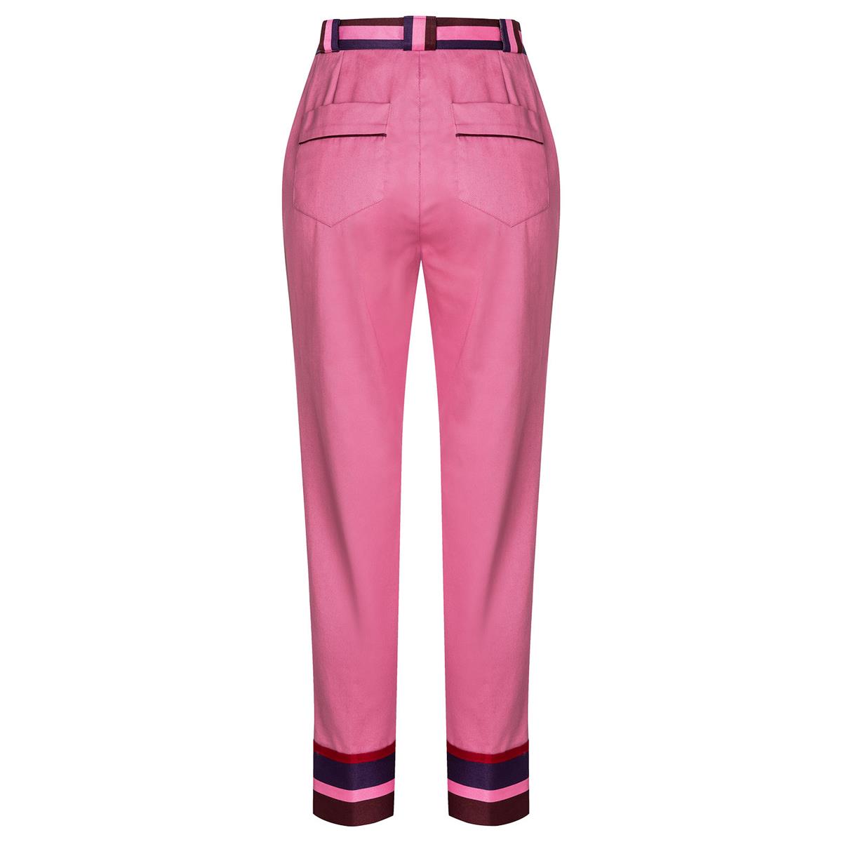 De tweede variant maakt creatief gebruik van reststof op de tailleband, riemlussen en zoom, waardoor de broek de charme krijgt van een riem en omgeslagen zoom.