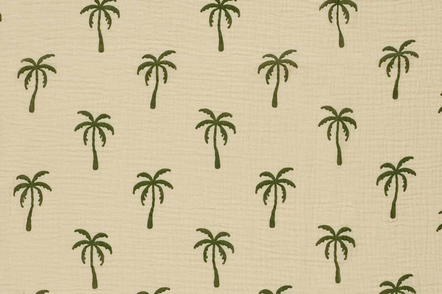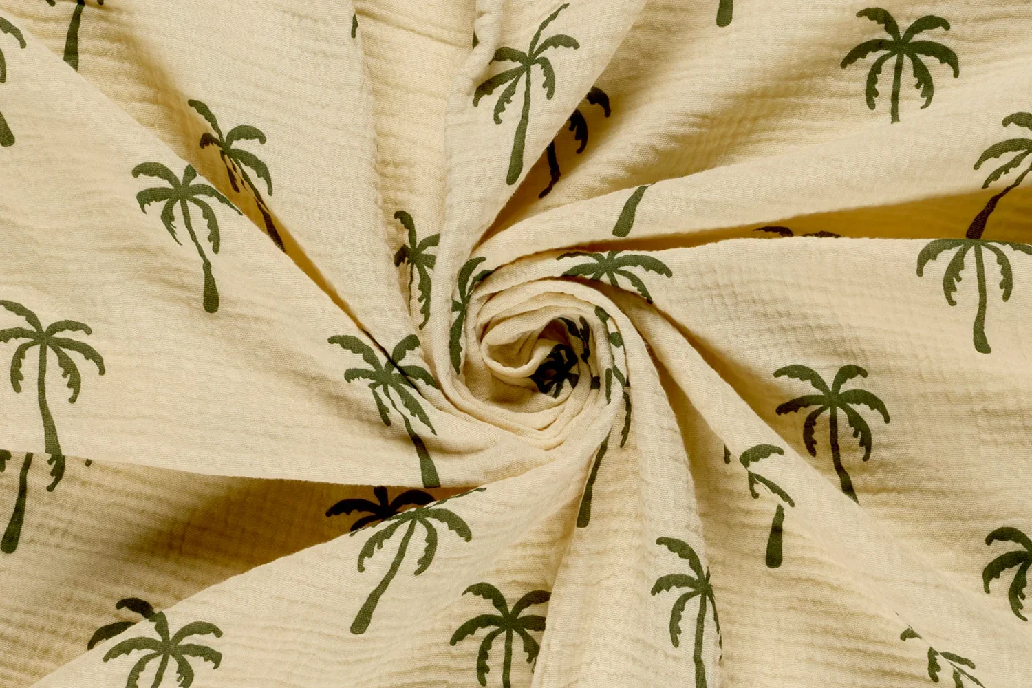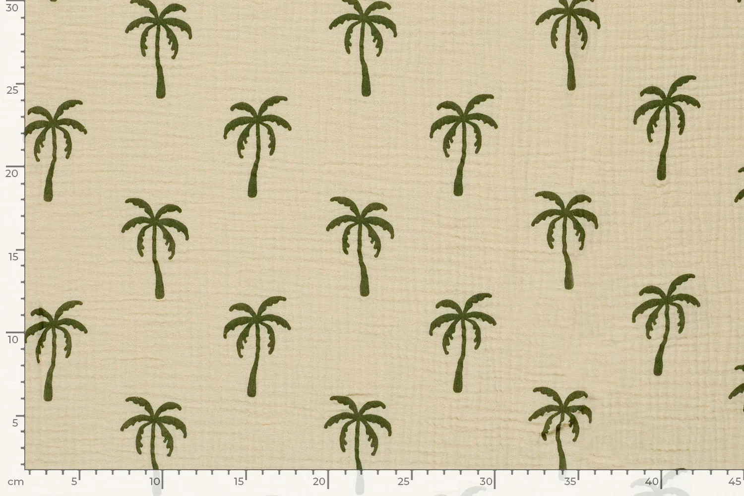 Double gauze mousseline stof, palmbomenprint, beige/groen. P636