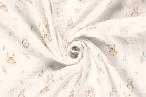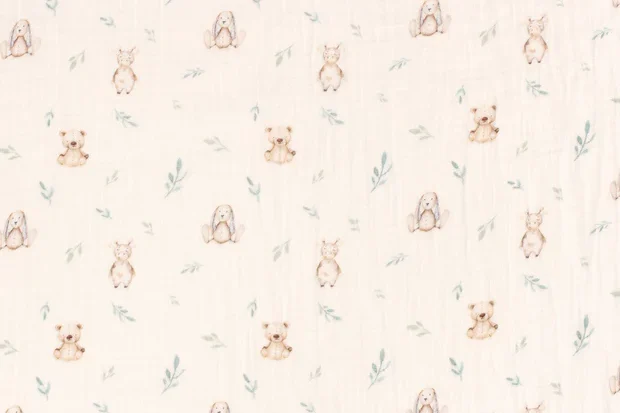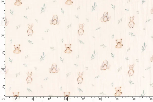 Mooie mousseline stof met een digitale print van beren, konijnen en giraffen.