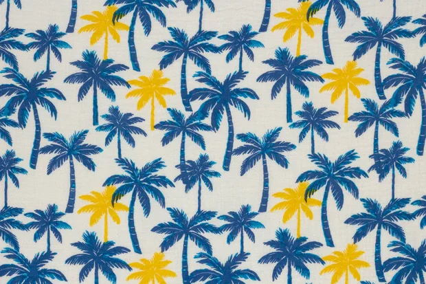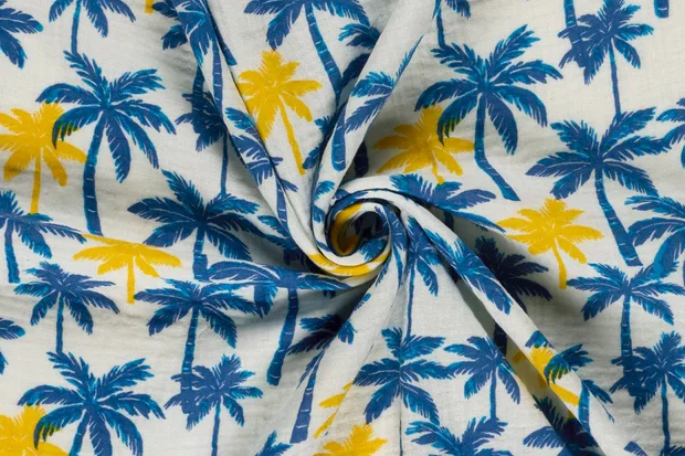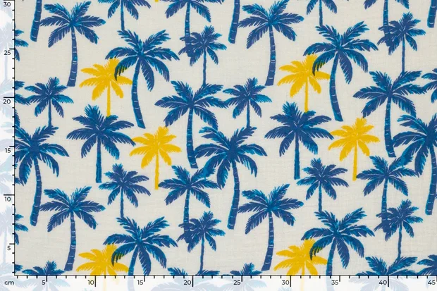 Mousseline stof, palmbomenprint, offwhite/blauw/geel. P717