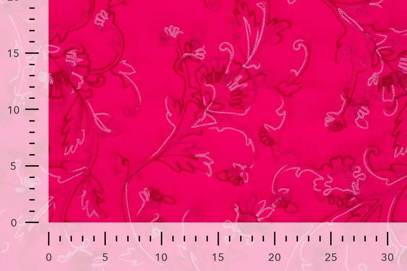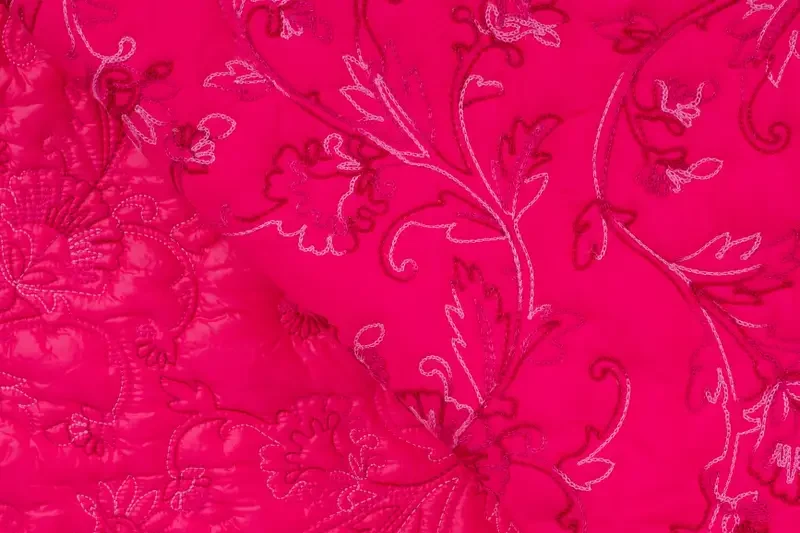 Gewatteerde embroidery quilt stof, geborduurde bloemen, fuchsia/rood/roze. P638
