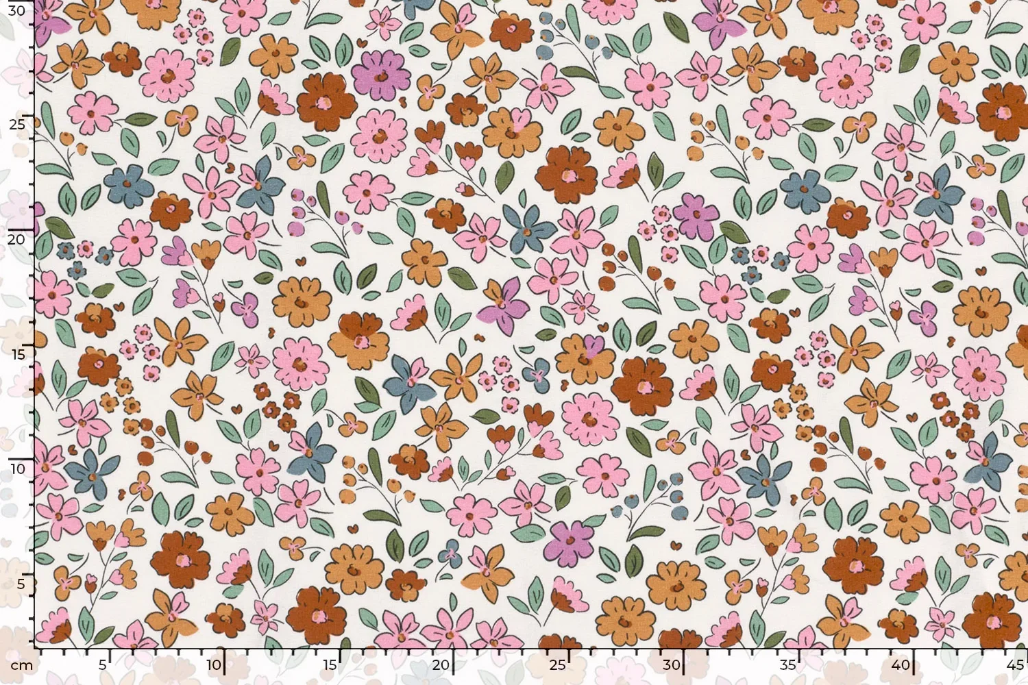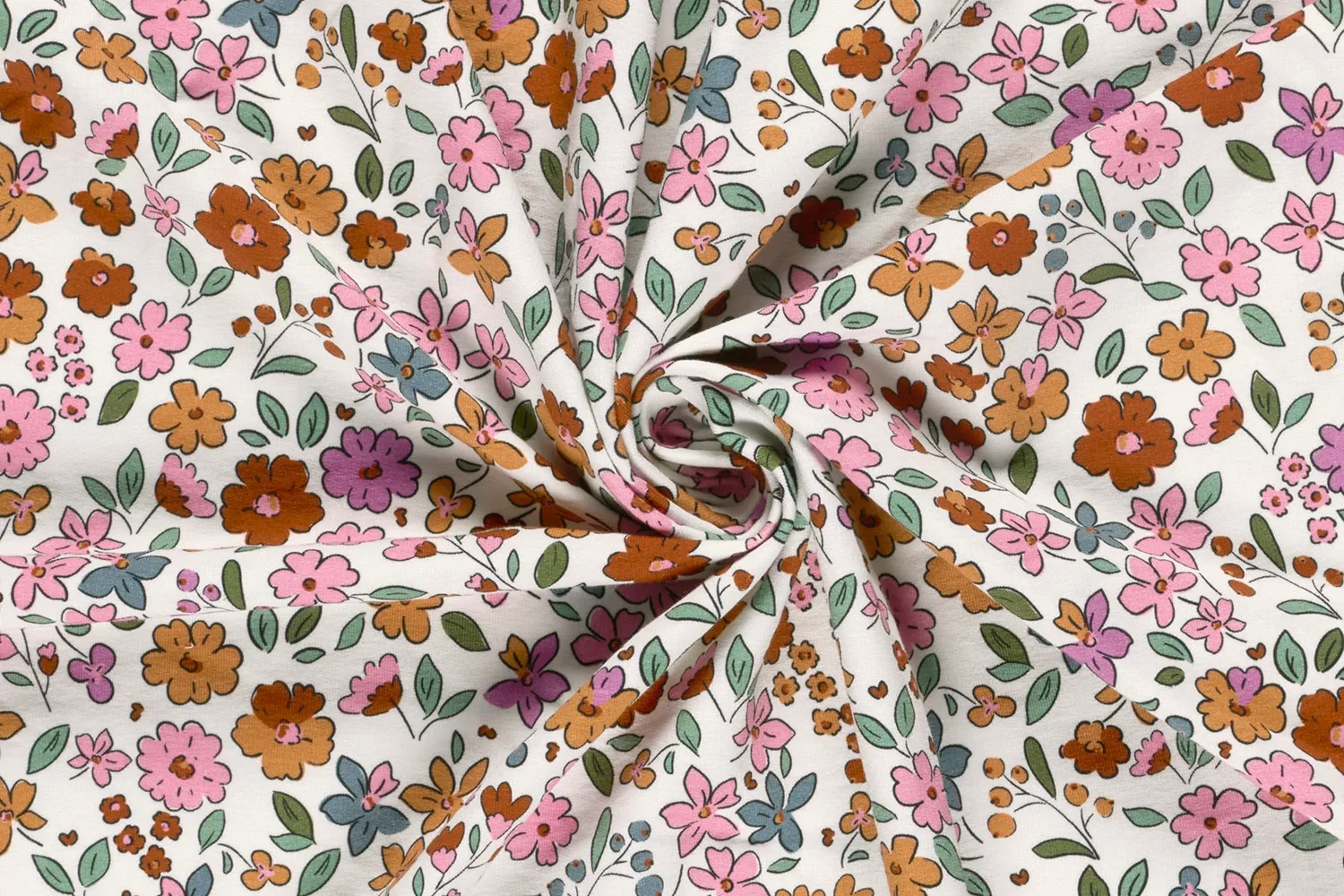 French terry stof, bloemenprint, offwhite/lila/roze/groen. P125