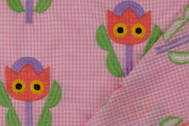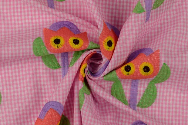 Mooie katoen poplin stof met een ruit motief met geborduurde bloemen.