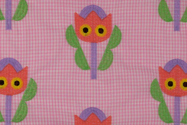 Katoen poplin stof, ruit motief met geborduurde bloemen, roze/wit/oranje/lila. P725