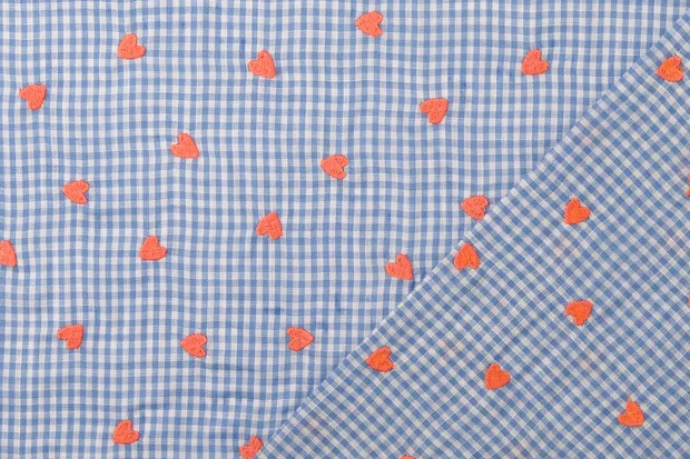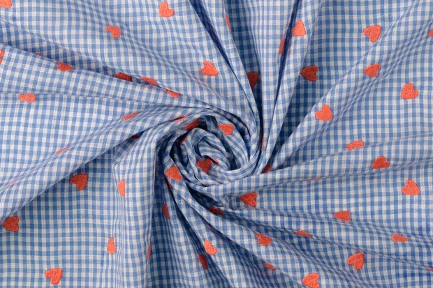 Mooie katoen poplin stof met een ruit motief met geborduurde hartjes.