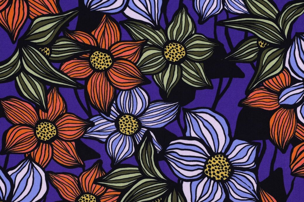 Ecovero, duurzame viscose stof, bloemenprint, paars/oranje/groen/geel, by Poppy. P146