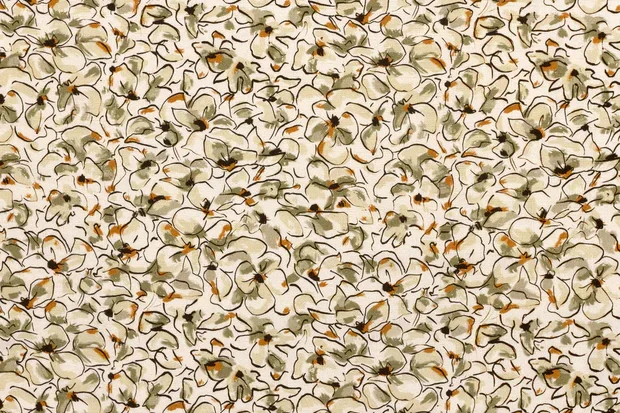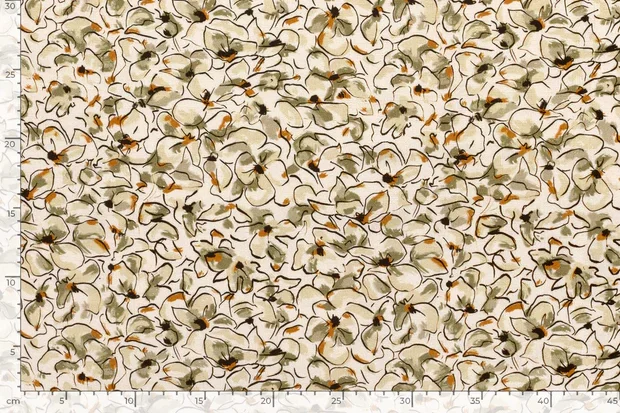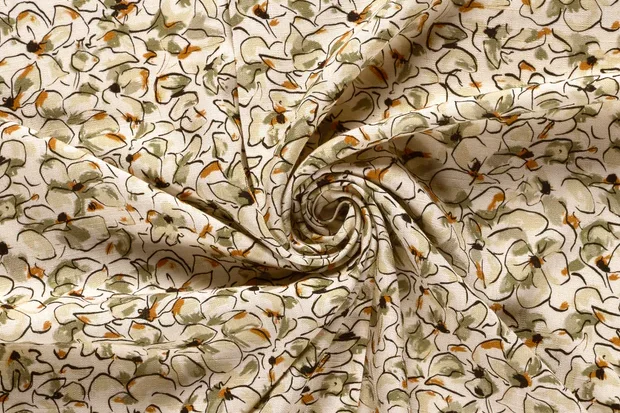 Linnen viscose stof, getekende bloemetjesprint, naturel/groen/grijs/bruin. P368