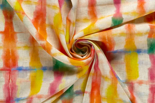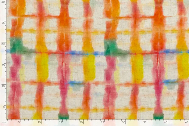 Linnen viscose stof, ruitprint, naturel/oranje/geel/groen. P366