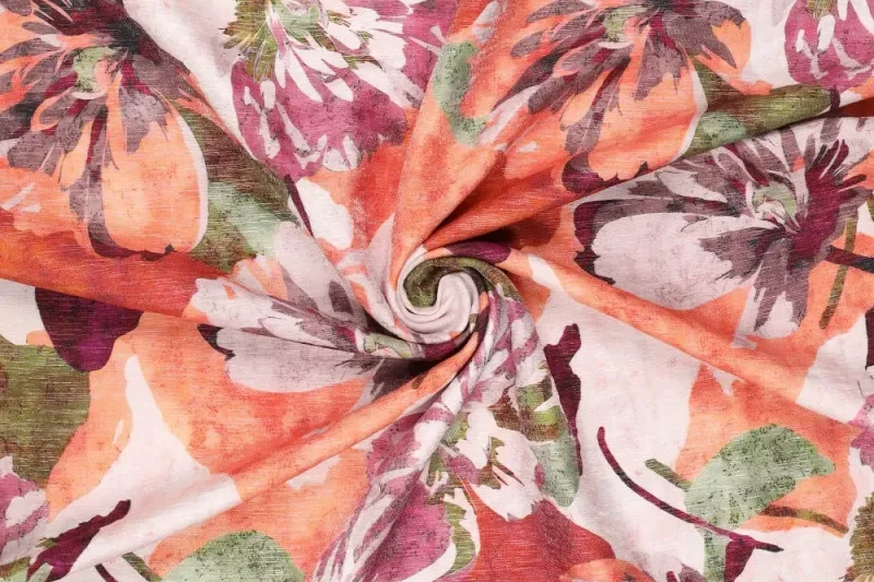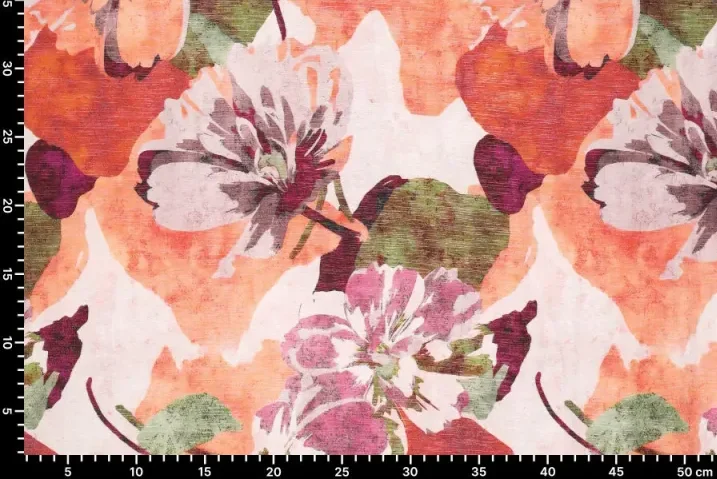 Shine viscose stof, grote bloemenprint, paars/oranje/groen/roze. P429