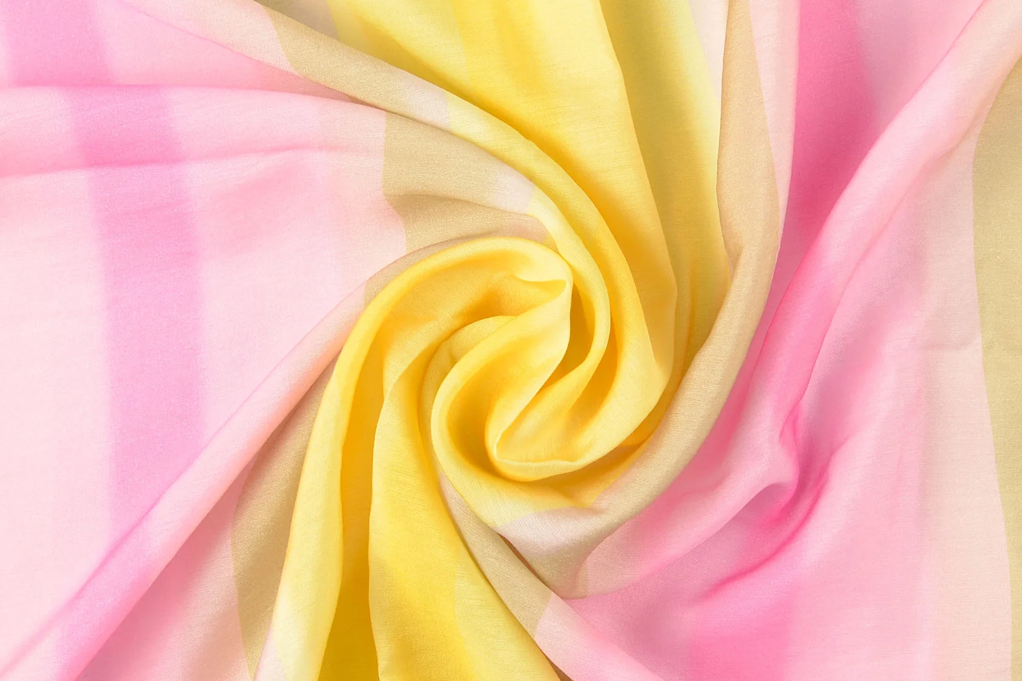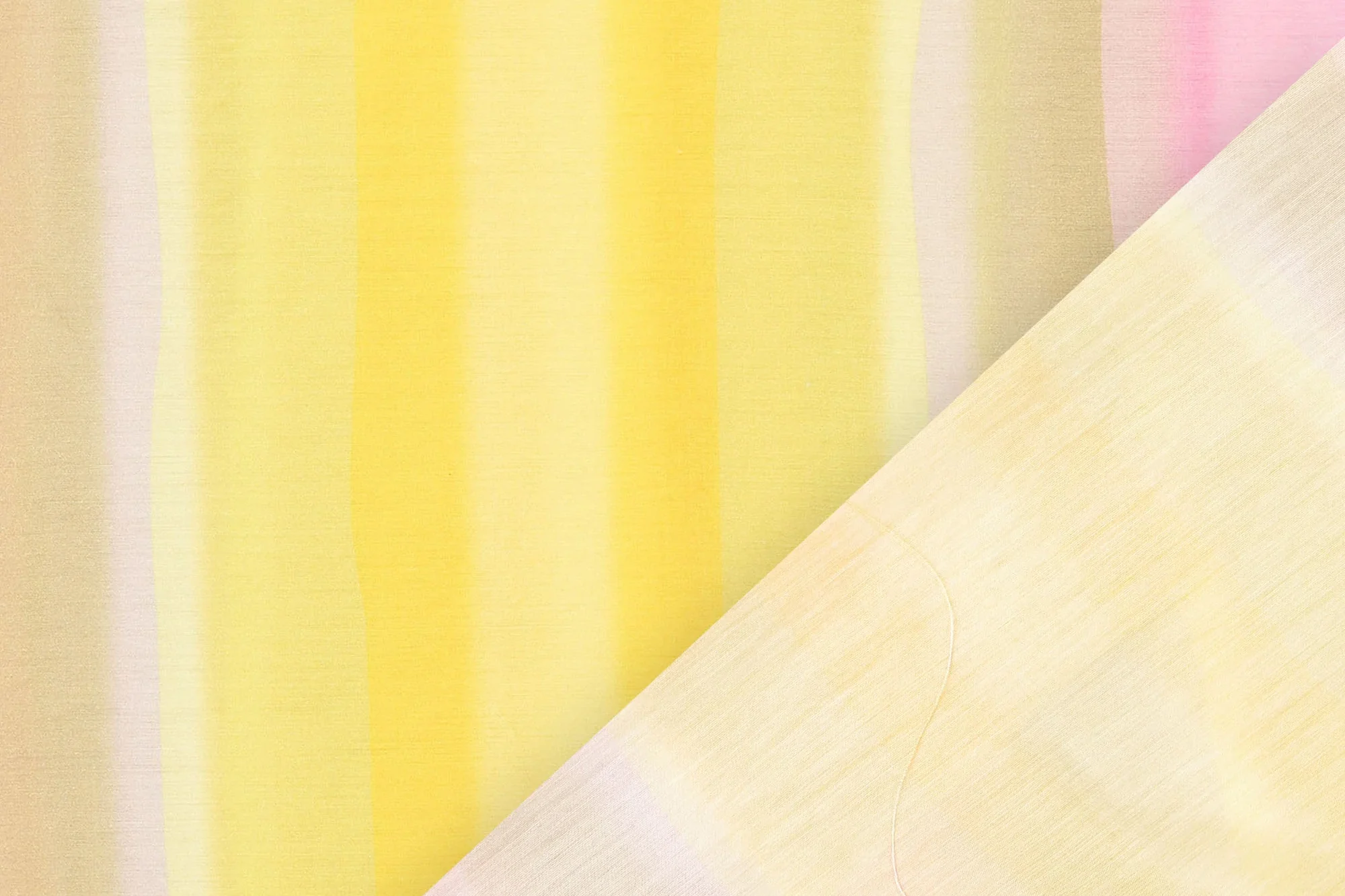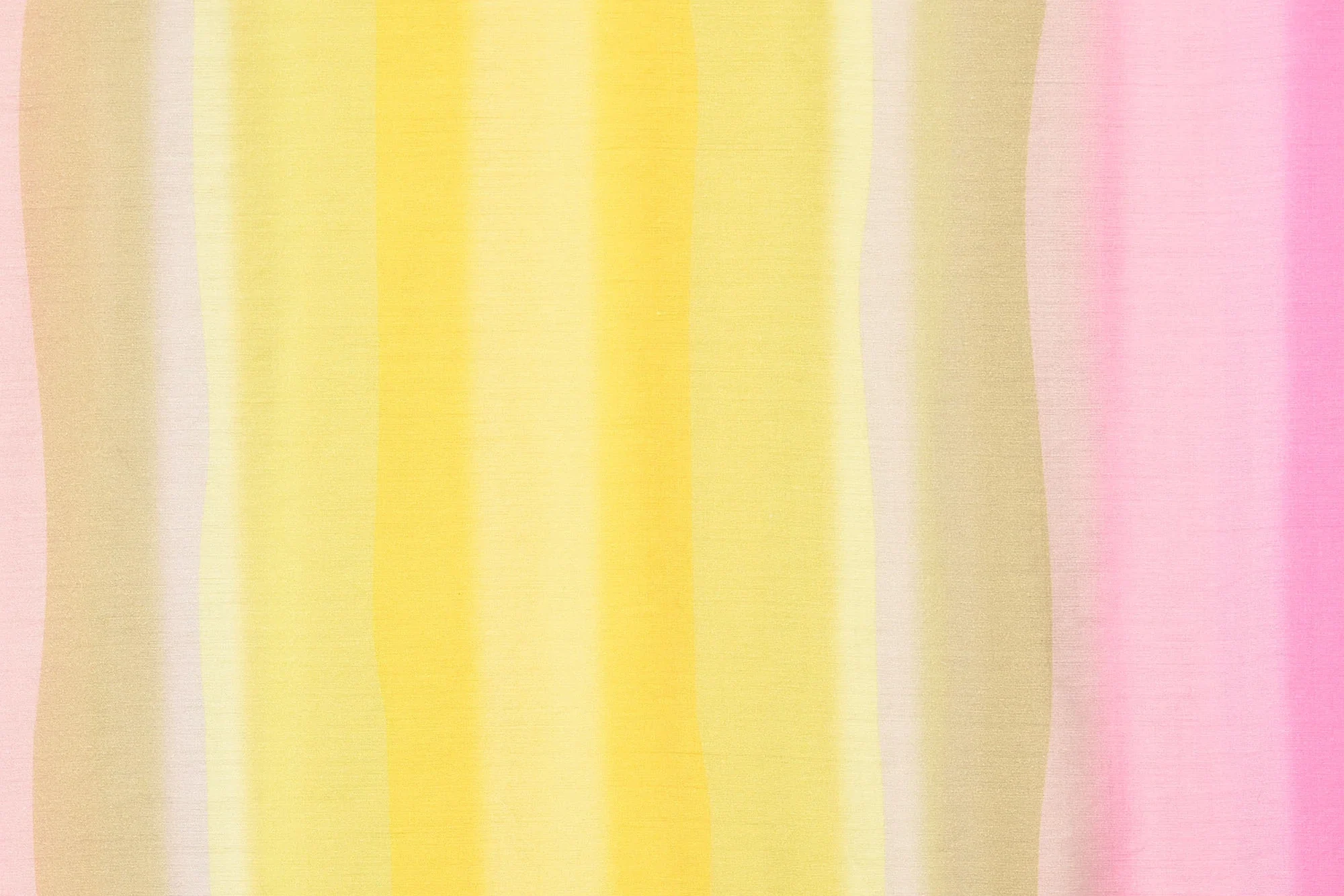 Soepel vallende viscose poplin stof, lengte streep motief, roze/geel/zand. P280