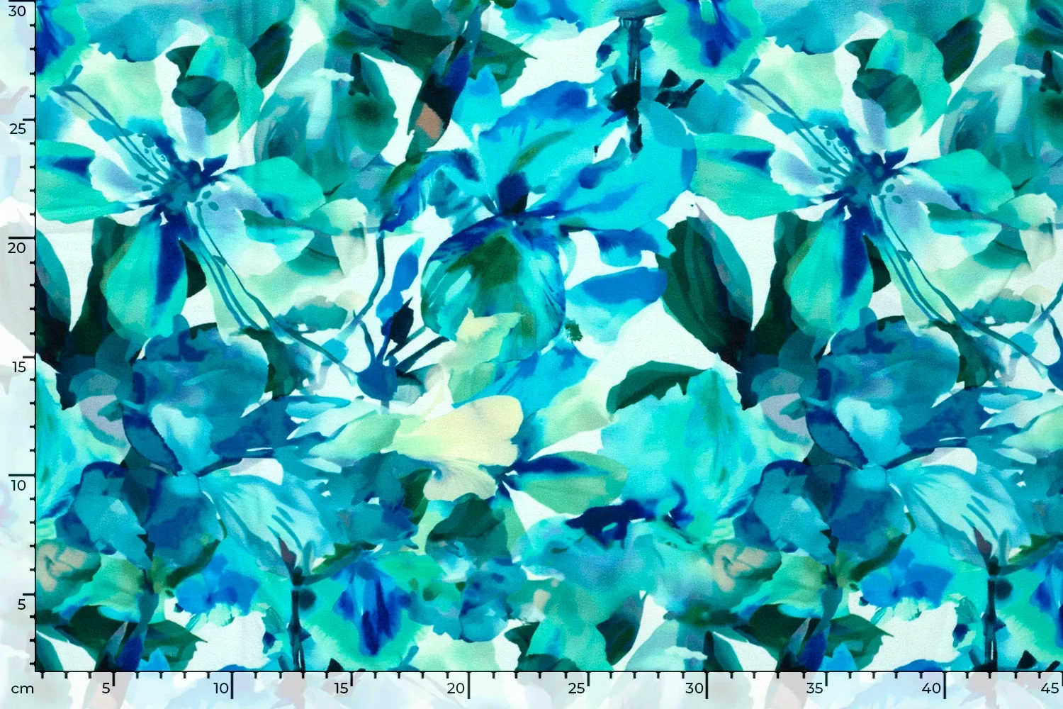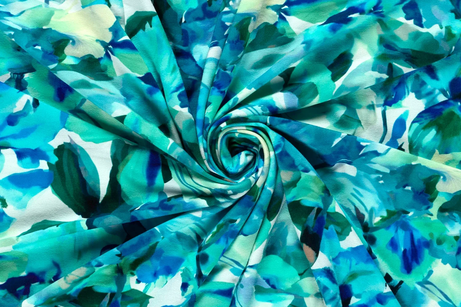 Viscose jersey stof, grote bloemenprint, wit/turquoise/groen/blauw. P290