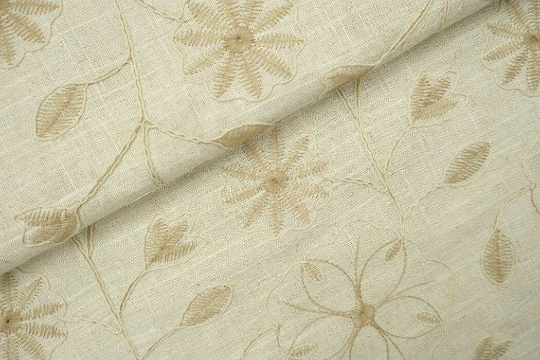 Viscose linnen stof, broderie, bloemen met blad motief, naturel/lichtbruin. P564