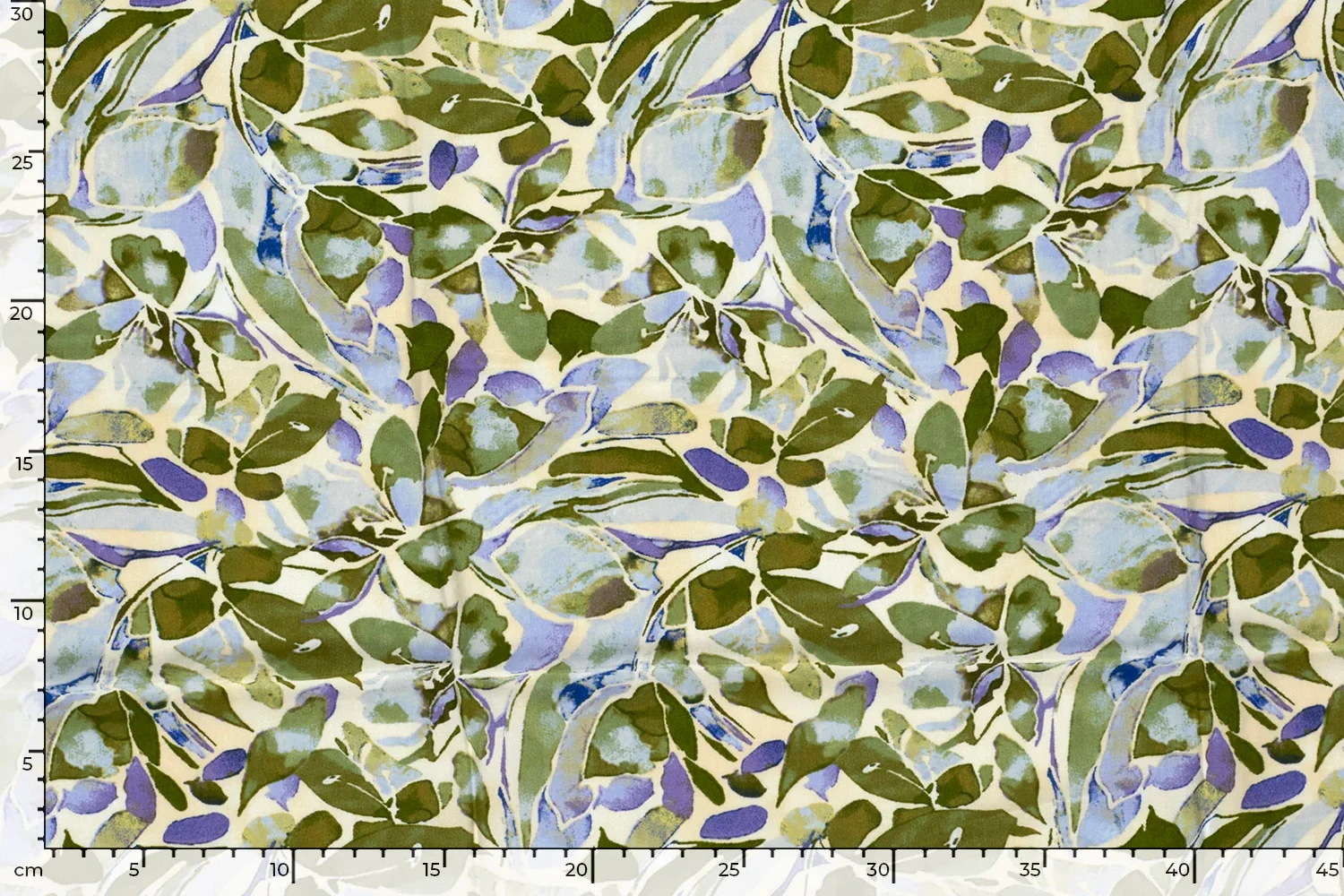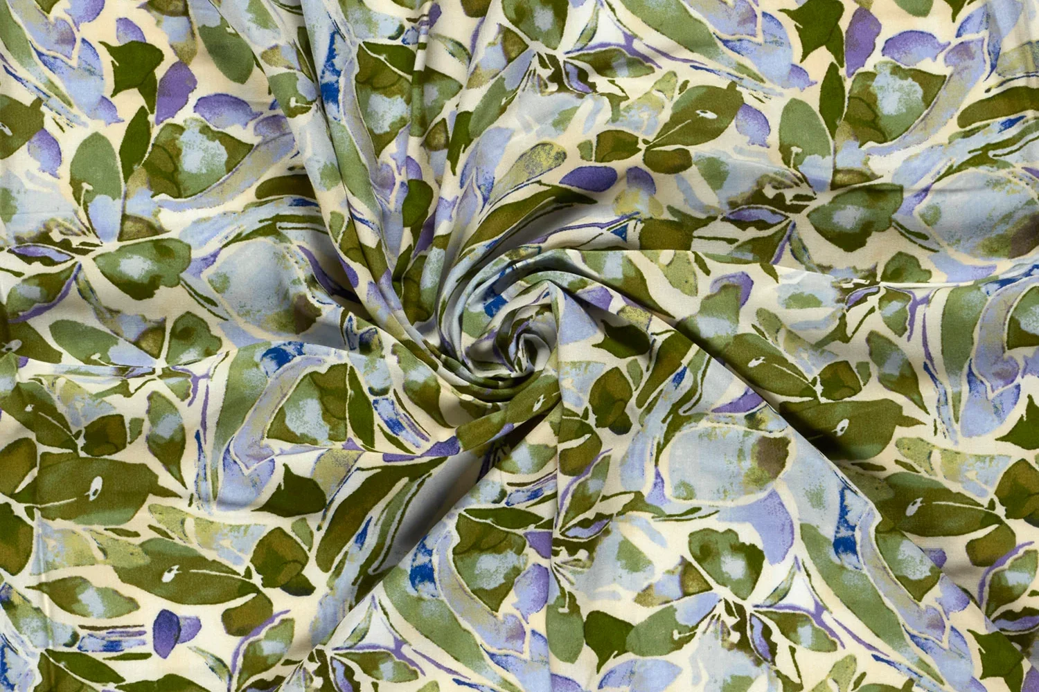 Viscose poplin stof, digitale bloemenprint, groen/beige/paars. P292