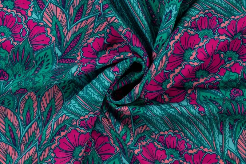 Mooie viscose satijn stof met een print van paisley bloemen.