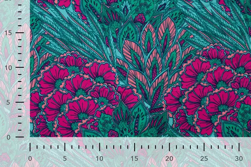 Viscose satijn stof, bloemen paisleyprint, fuchsia/blauw. P416