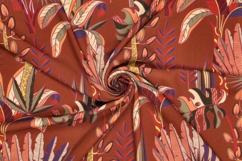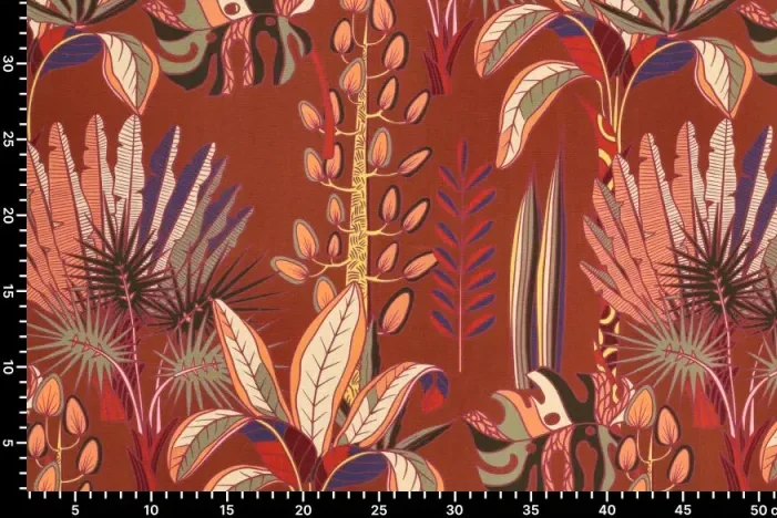 Viscose slub stof, soepel vallend, jungle print, roest/oranje/paars/groen. P234
