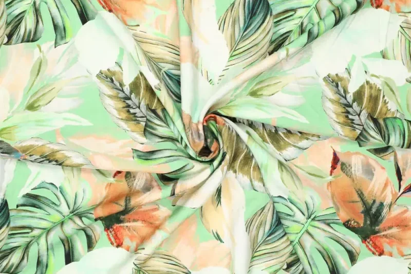 Viscose twill stof, bladerenprint, groen/zalm/offwhite/beige/donkergroen. P316