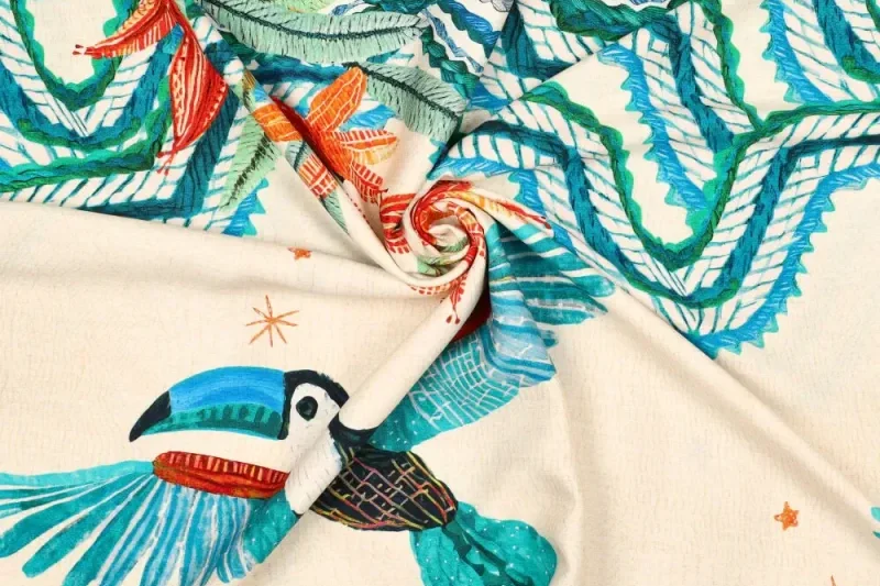 Mooie viscose twill stof, een randstof met een doorlopend paneel met vogels.