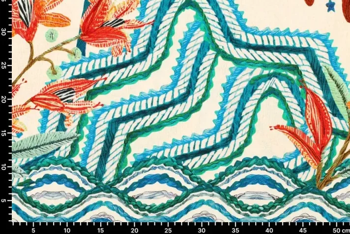 Viscose twill stof, randstof, doorlopend paneel met vogels, zand/creme/blauw/oranje. P438