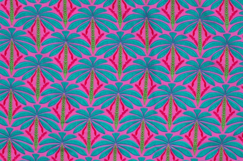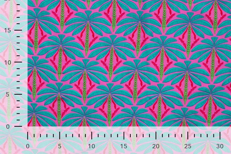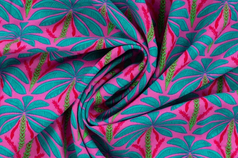 Viscose voile stof, palmbomenprint, roze/turquoise/rood/groen. P639